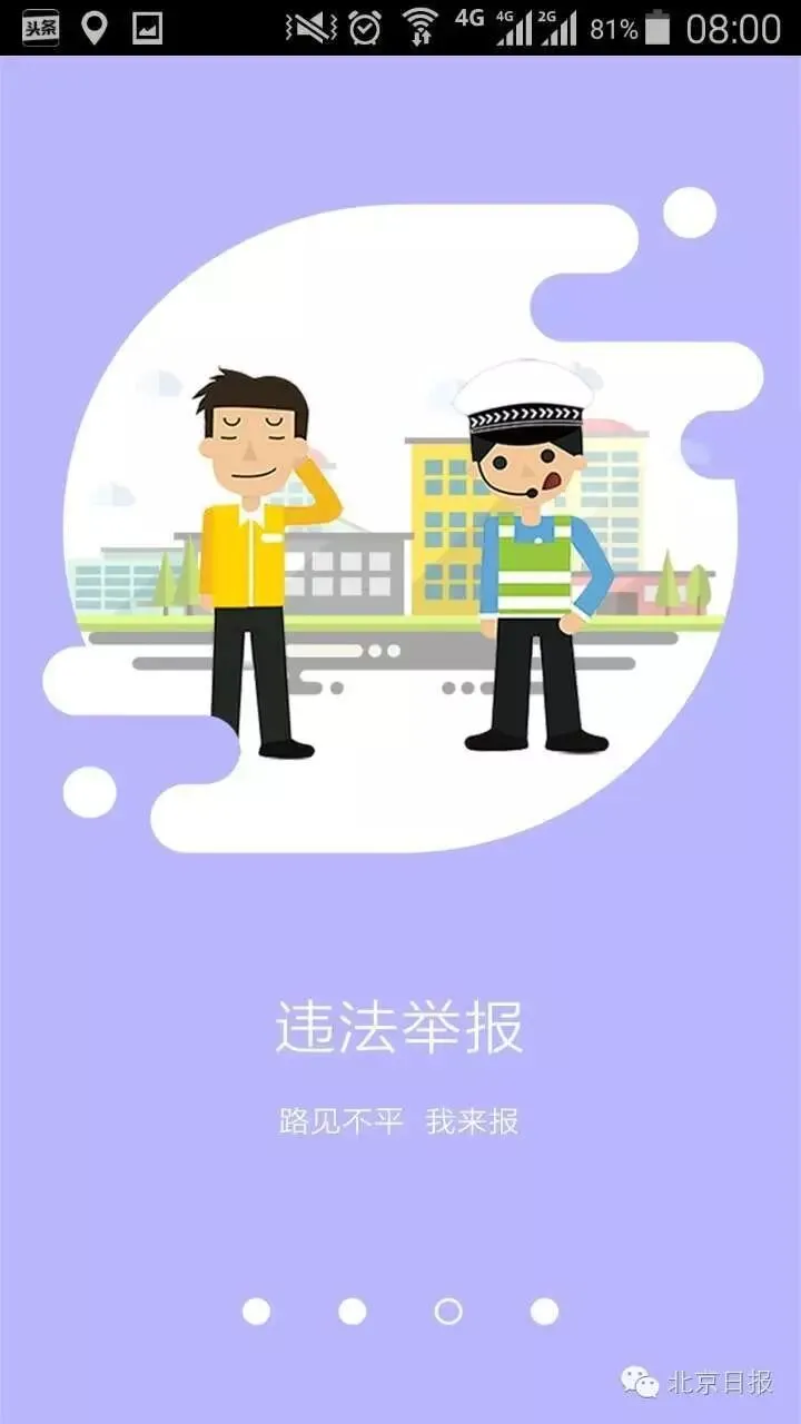 通过“北京交警”APP还可以实名或匿名举报违法,交管部门会保护举报人的个人隐私。违法行为发生地交通部门接到举报后,执法民警会在24小时内进行审核、处理。实名举报每日可获取15分积分奖励,积分的使用规则正在研究中。
