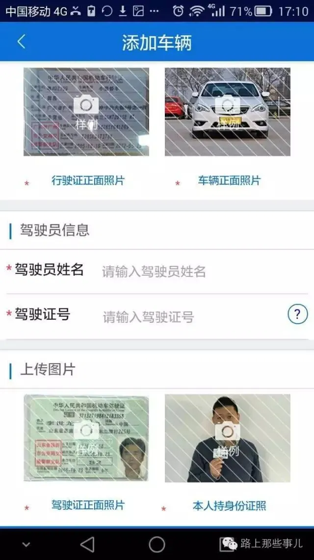 点击“添加车辆”输入机动车类型、车牌号、发动机号,页面跳转后,需要上传4张照片,分别为行驶证正面照片、车辆正面照片、驾驶证正面照片、本人持身份证照,同时输入驾驶员姓名和驾驶证号。以上信息都添加好,选择进京日期、进京时长和进京路口就可以提交审核了。