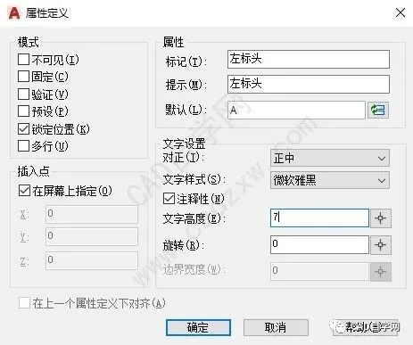 Step 2:建立轴网序号标签。在轴网的两端分别建立两个轴网标头,这里以圆形样式为例进行绘制,并且使用“属性定义”功能建立两个表头文字,属性定义的设置如图2所示。分别命名为“左标头”和“右标头”。
