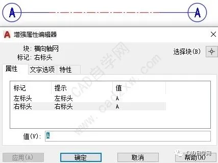 Step 5:将左右轴网标头文字关联。同一根轴的左右标头文字一定相同,但是为了避免用户忘记更改的风险,这里采用“字段”功能。退出块编辑器,在正常绘图区域中,双击轴网,弹出“增强属性编辑器”对话框,这里我们选择将右标头关联至左标头,以后修改标头,只需要修改左侧即可。