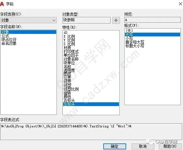 在“值”中选中当前值A,然后右键选择“插入字段”,弹出“字段”对话框,如图7所示,字段类别选择“对象”,随后点击对象类型旁边的选择按钮,选择绘图界面中的轴网,随后返回到此页面,特性选择“左标头”,“格式”中选择“大写”,随后确定。这样,我就完成了左右标头文字的一致性关联。一根轴网完成,随后通过复制/粘贴可绘制多条。