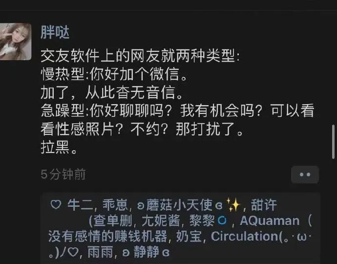交友软件上的两种网友类型…… 1 轻轻松松月入五千的方法 (素材来源网络,侵删) ▼ 2 像极了期末复习的你 (via.段子楼,侵删) ▼ 3 听说你想要中国的熊猫 ▼ 4 听说学校附近有野人出没 (素材来源网络,侵删) ▼ 5 梦见和孙悟空开房 (素材来源网络,侵删) ▼ 6 如何证明没有怀孕? (via.豆瓣@宛棠梨煎雪,侵删) ▼ 7 交友软件上的网友类型 ▼ 8 哈哈哈哈 ▼ (关注超模君视频号,天天追剧不停歇!) 你点的每个赞,我都认真当成了喜欢