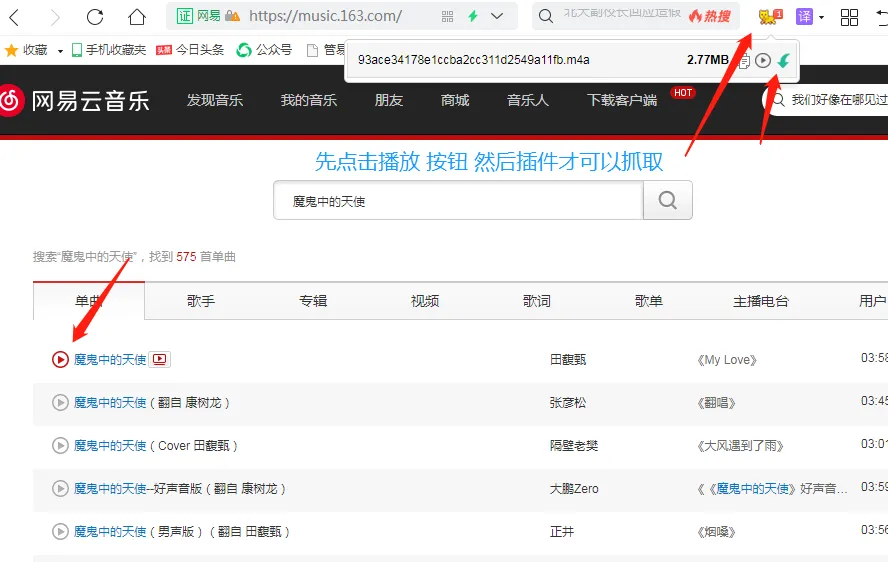 只要是能点击播放的音乐,这款插件都可以直接抓取然后进行下载!嘻嘻