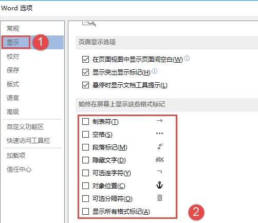 通过此开关可控制的常见编辑标记有空格、段落标记、制表位等编辑文档常见的基础格式,在【选项】中可以看到: