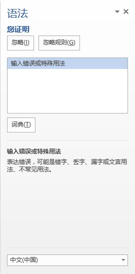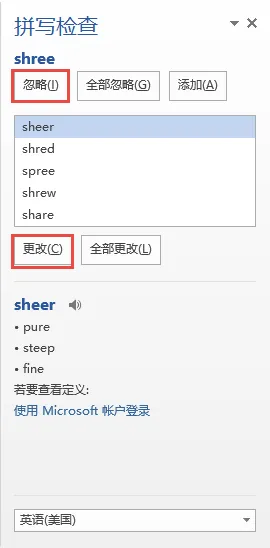 对于发现的拼写和语法错错误结果,会在【拼写/语法检查】窗格中一一提示,用户可根据需要选择忽略或者更改: