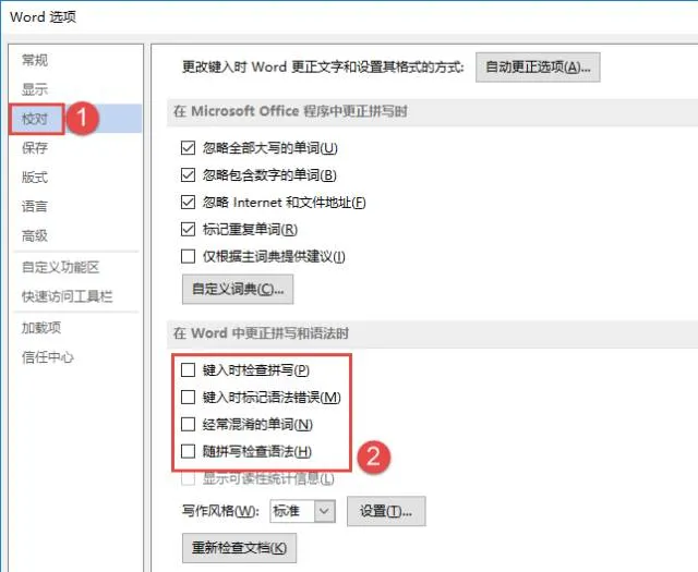 当我们不需要更改或者修正的时候,又不想看到这些波浪线,可以通过【Word选项】中的设置将之隐藏:隐藏的方法是将下图中红框线内的4项复选框全部取消选择即可。