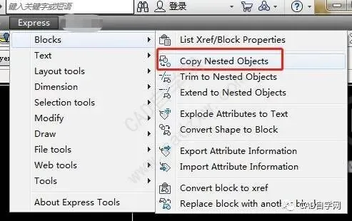 命令调出方式:菜单栏,Express(扩展工具),Blocks(块),Copy Nested Objects(复制嵌套对象)。或命令行输入命令Ncopy。然后选中所需复制内容,复制即可。