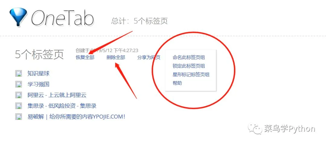 点击这个图标,当前窗口打开的所有标签页会自动关掉,取而代之的是一个Onetab页面(下图),在这里可以对标签进行单独的恢复或删除,也可以进行批量处理,并且还允许对标签进行分组、锁定等操作。