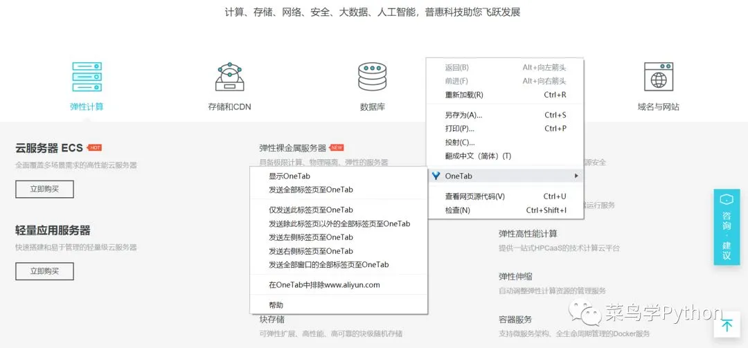 除了上面说的这种方法之外,Onetab还有一种更加灵活的操作方式:在当前页面点击鼠标右键会发现多了一个”Onetab“图标(下图),在这里可以选择将哪些标签送入Onetab。