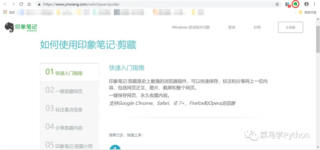 Evernote Web Clipper安装后的图标是下图中的样子,同时,插件安装后会自动跳转到”印象笔记·剪藏“说明页面,这里我还是进行一下简单的演示。