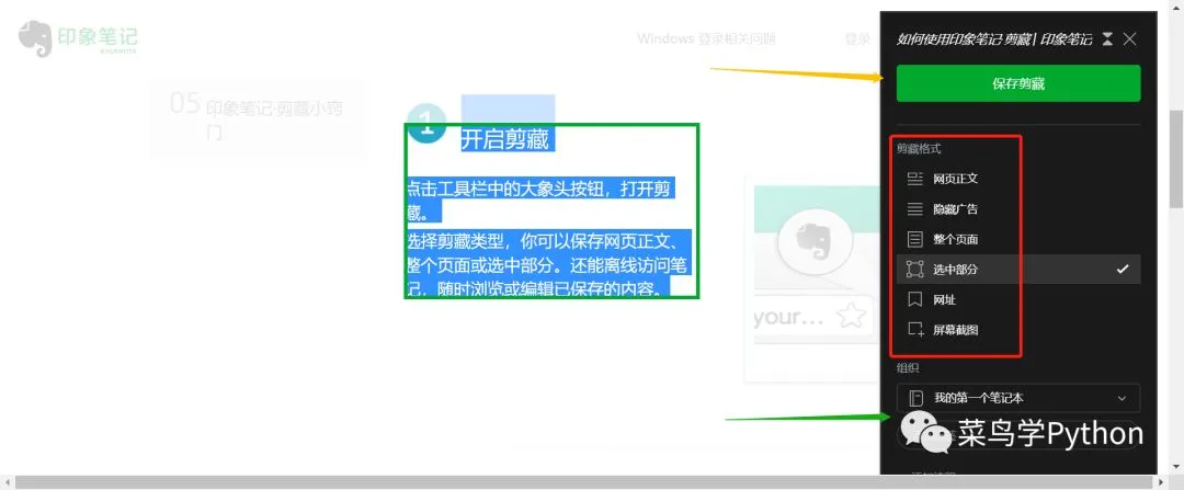 选中想要剪藏的内容,点击浏览器右上角的Evernote Web Clipper插件图标就会出现下图中的剪藏选项。在这里可以选中想要剪藏的内容范围、存储的位置等,然后点击”保存剪藏“完成操作。