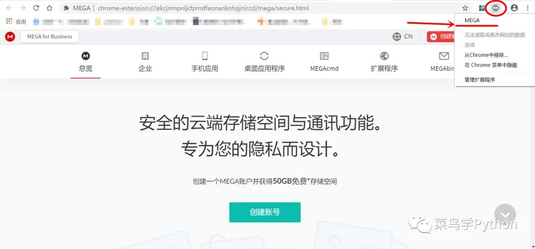 点击浏览器右上角的MEGA插件图标,进入下图所示的页面,创建账号即可获得50G的免费存储空间。