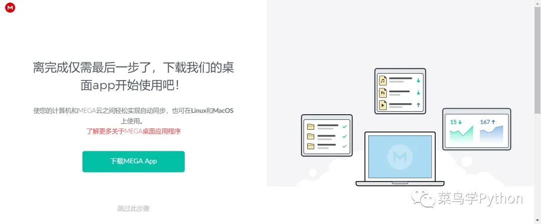 注册过程非常简单,一般不会遇到什么坎,如果已有MEGA网盘账号的话,这里直接登陆就可以了。如果是新创建的账号可能会提示安装MEGA桌面应用,这个完全出于自愿,不想安装的话直接跳过就好,不会影响使用。
