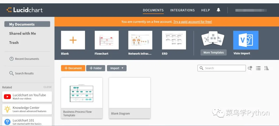 运行后会开启一个新的标签页,如果是第一次使用会要求注册,还会进行一些基本的用户调查,接着就会进入Lucidchart的主页面了(下图),和其他多数绘图软件类似,Lucidchart Diagrams也支持空白图表和多种模板的建图模式。