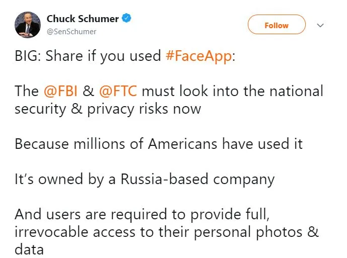 根据美国国家公立广播网的报道,美国民主党的资深大佬、美国参议员查克·舒默(Chuck Schumer),昨天就在他的个人社交帐号上发帖,要求美国联邦调查局(FBI)和美国联邦贸易委员会必须对这款“威胁着数百万美国人民”的“FaceApp”展开调查。