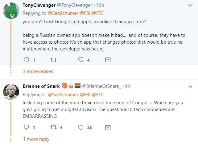 还有网民吐槽这些美国的参议员是“科技文盲”,称这本来就是个变脸的APP,不上传图片人家怎么给变?