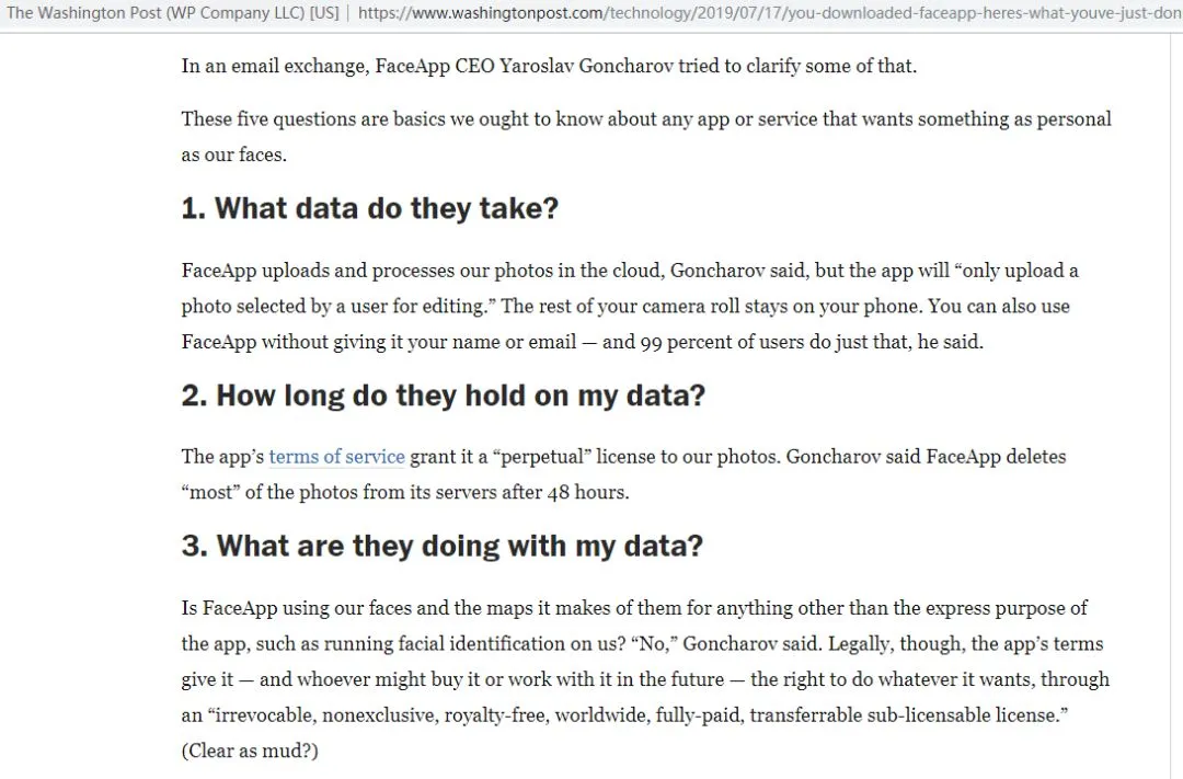 美国《华盛顿邮报》则采访了“FaceApp”的俄罗斯CEO,对方介绍说他们只会在云服务上保存用户授权上传的照片,而且48小时后就会自动删除,俄罗斯政府也不会拿到这些数据——更重要的是,这款APP的用户不需要登记姓名和邮件地址也可以使用“变脸滤镜”修改自己的照片,也就更不存在所谓的“俄罗斯政府会通过这个APP悄悄搜集你的照片、姓名、邮件等隐私信息”的阴谋论了。