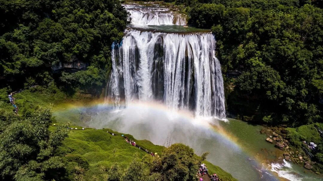 贵州安顺:黄果树瀑布现美丽彩虹,吸引游客观瀑赏虹纳凉。(视觉中国)