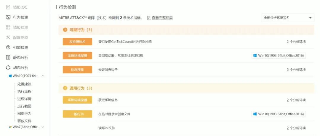 通常恶意软件检测到自己是在沙箱里面,就会变现得正常来逃避检测,微步云沙箱用上了动态检测和了十多种“反-反沙箱”策略的技术。