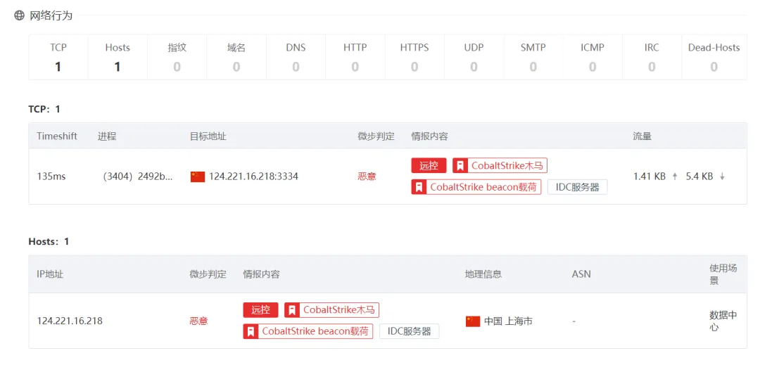分析完成之后,你能看到软件运行日志,操作和读取了电脑上的哪些文件,连接了哪些网址等等,在网址的分析上,微步云沙箱还会根据自己保存的恶意网址来进行对比,让你一眼就能看出是不是恶意行为。