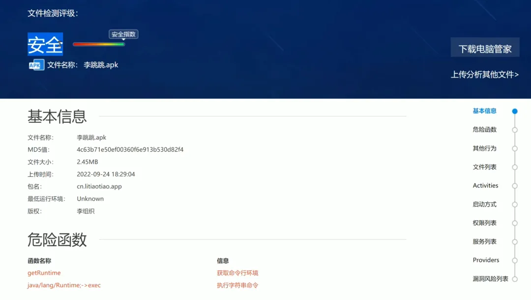 它汇集了 20 多款不同国家的反病毒引擎,有着众多病毒的特征信息,可以分析的文件不只是EXE软件,还有Python的脚本、Word文档、压缩文件、PHP和批处理文件等等。