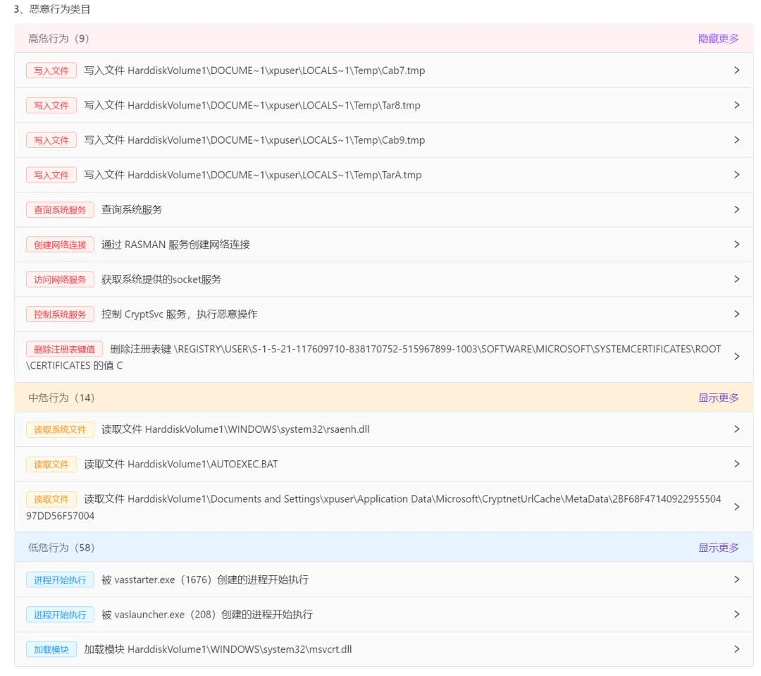 那就找一个真的恶意软件来试一下。相关的恶意行为被列出来了。