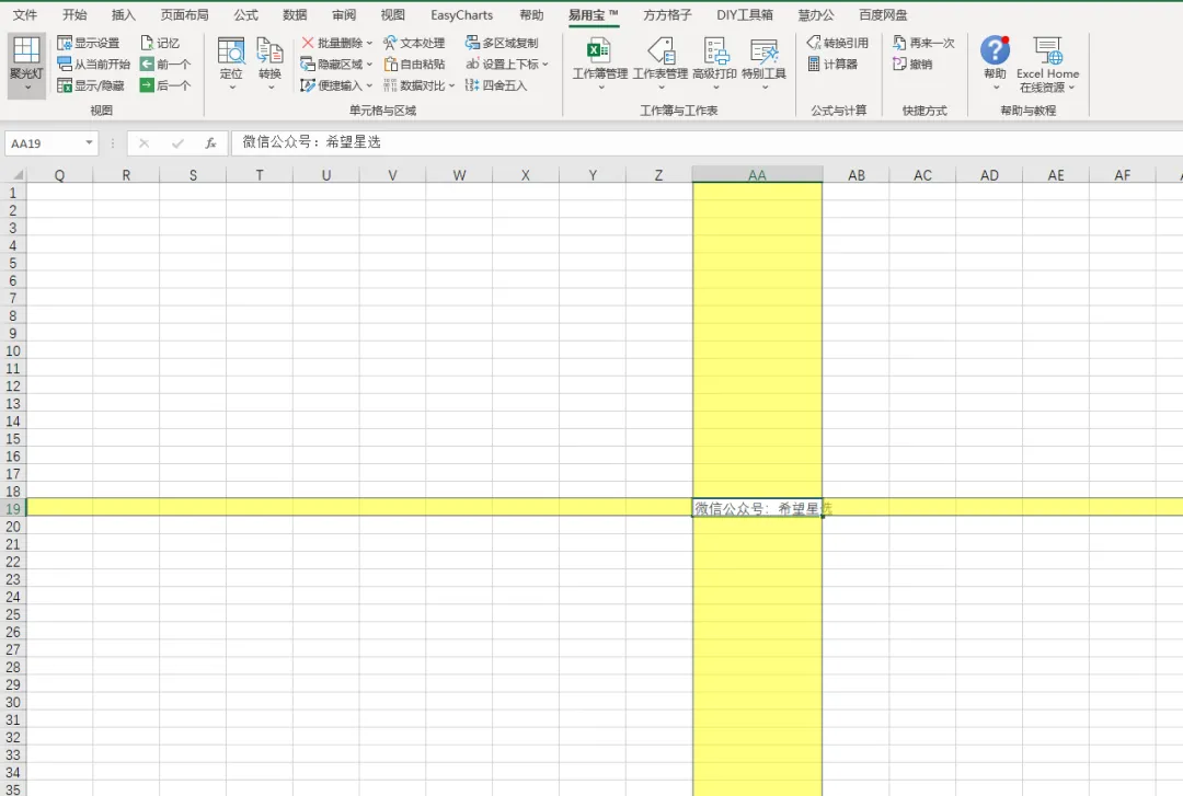 当浏览超出屏幕范围的大数据表时,只要单击一下 Excel 易用宝“聚光灯”按钮,就可以用自己喜欢的颜色高亮显示选中单元格/区域所在的行和列,我们就可以看到显示: