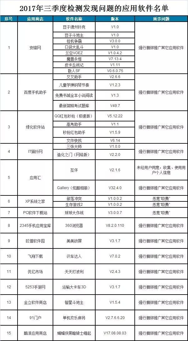 2017年第三季度,工业和信息化部对55家手机应用商店的应用软件进行技术检测,发现违规软件31款,涉及违规收集使用用户个人信息、恶意“吸费”、强行捆绑推广其他应用软件等问题。这些不良软件已全部被责令下架。名单详见↓↓