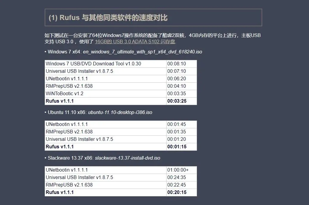 除了选择镜像文件,基本可以自动识别并适配所有内容,不需要由于文件大小限制以及引导问题将格式改来改去,它的第二大亮点就是速度快,官网也放了一些几个与其他相关软件的对比图,大家可以参考一下;