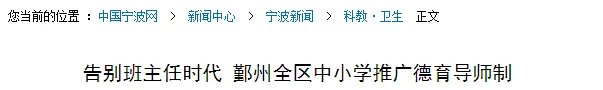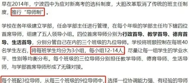 01 中小学要取消班主任了? 班主任作为班级的“顶梁柱”,是最不可缺少的。 如果有这样一所学校,没有行政班级,没有班主任,你会让孩子就读吗? 宁波市鄞州区教育局发文官宣: “全区高中、中心初中、中心(级)小学开始实施德育导师制,逐步向个年极段推行。” 每个班级不设班主任,只有3位导师管理班级。 首席导师由能力强、经验丰富的教师担任。 副导师由任课教师担任,一般为青年教师。 “让每个老师都参与德育,让每个学生都得到关注。” 宁波四中也取消了班主任制度,实行“导师制”。 一个班级分配3位导师,分别负责教学、德育、生活。 再将每班学生分为3小组,每组12-14人,更方便管理。 如此一来, 彻底改变了班主任一人统管全班的局面, 把班主任工作划分得更细致,实现了教师既教书、又育人的目的。 人民日报为他们的大胆改革点赞: “若把学校比人,宁波四中颇有“宗师”气派! 守得住教育的初心,耐得住浮华的寂寞,守成持重,又能开风气之先,姚江畔的这所百年名校,坚守“诚朴爱”校训,正在续写新的辉煌篇章。” 不少地区的家长听说后,也纷纷建议在全国取消班主任,推广“导师制”。 现如今,有不少中学开始推行“导师制”,且各有特色: 杭州高级中学钱塘学校,公布教职工的任教学科、特长、荣誉等信息,让学生反选导师,就像《中国好声音》一样; 山西省实验中学,学生和导师双向选择,导师们为学生提供包括学业、思想、心理、生活等方面的“VIP 服务”; 天津二南开学校,开设“未来学部”,学生根据兴趣爱好选科,像大学一样“走班”上课,取消行政班; …… 按照这个趋势,“中学导师制”将成为主流。
