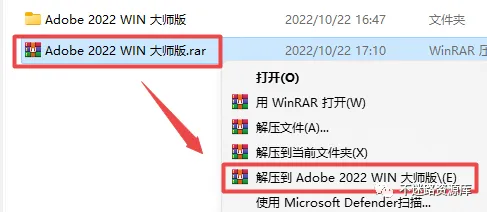 1.选中下载的压缩包,然后鼠标右键选择解压到“Adobe 2022 WIN 大师版”(没有解压选项点这里)
