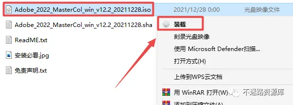 2.打开刚刚解压的文件夹,找到并选中“Adobe_2022_MasterCol_win_v12.2_20211228.iso”文件,鼠标右键选择“装载”(如果没有“装载”选项的可以右键选择“打开方式—Windows资源管理器”打开,Win7系统点击鼠标右键解压)