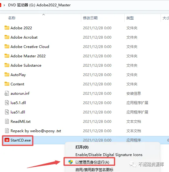 3.在打开的文件夹,找到并选中“StartCD.exe”,鼠标右键选择“以管理员身份运行”