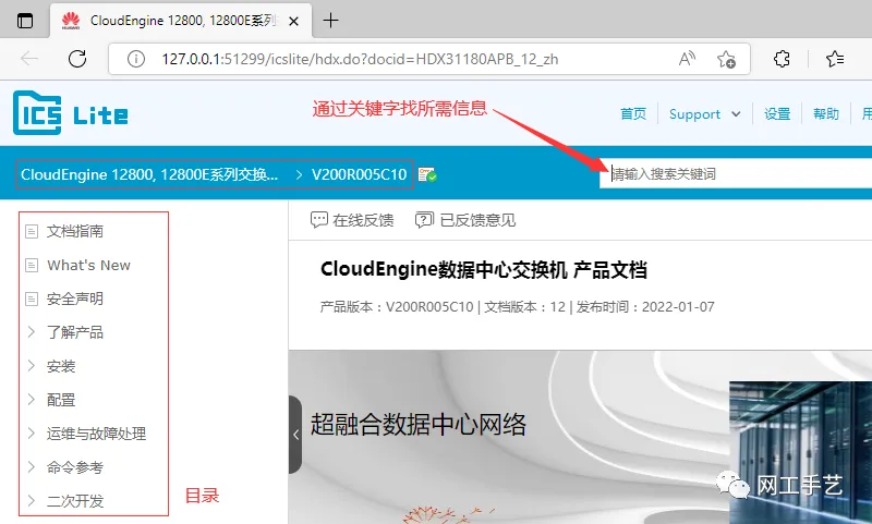 与通读学习相对应的是把产品文档当成字典来检索查阅,或许这种方式更为可行。不同厂商设备会有不同的产品文档阅读器,文档信息结构编排方式等,但是大体对不同主题,不同关键字会做一些索引。我们可以通过关键词搜索查阅的方式,来定位到我们要的相关内容,包括技术原理(可学习),命令配置(可练习)。