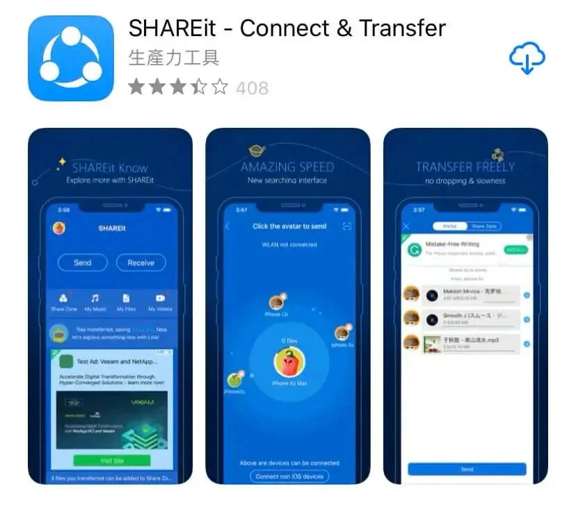 这个App蛮让我意外的,相信应该不少人不知道SHAREit,它是一款工具类App,让你在不同手机、电脑、甚至与平板之间互传档案的一套工具。无论你的手机用iPhone或Android,电脑用Windows或Mac,都可以透过它来即时传输档案、音乐、照片、影片,全方位支援。