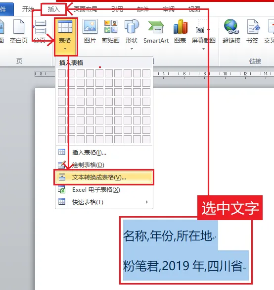 (2)第二步:选中要转换成表格的文字,选择“插入”工具→选择“表格”中的“文本转换成表格”。