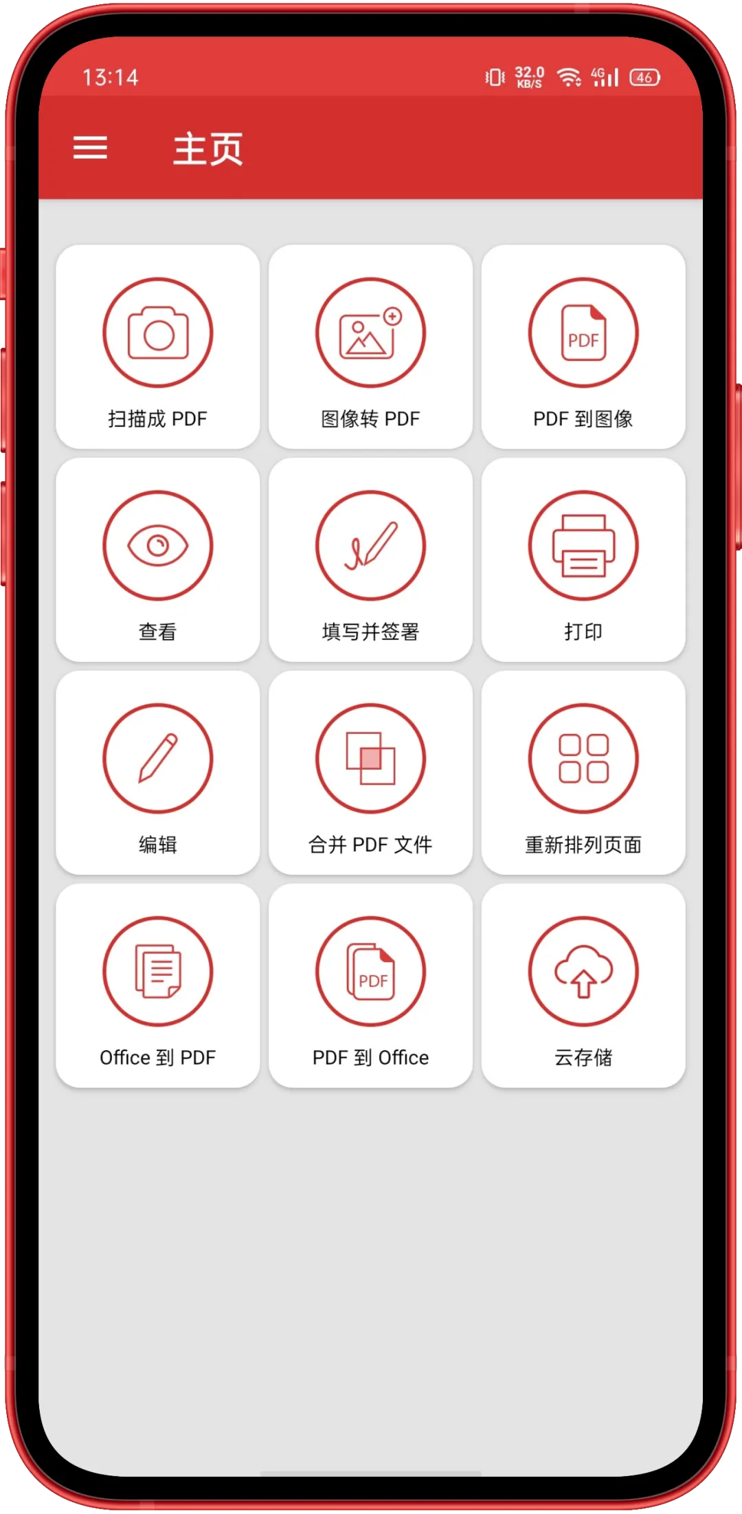 如上图所示,PDF Extra APP 的主页展示了其全部功能:扫描成 PDF、图像转 PDF、PDF 转图像、阅读查看、填写并签署、打印、编辑、合并 PDF 文件、重新排列页面、office 转 PDF、PDF 转 office 以及云存储。