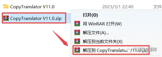 1.选中下载的压缩包,然后鼠标右键选择解压到“CopyTranslator V11.0”(没有解压选项点这里)