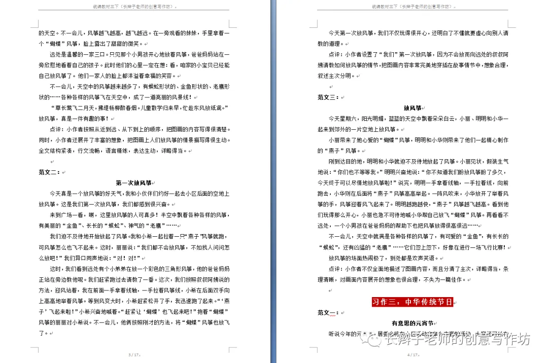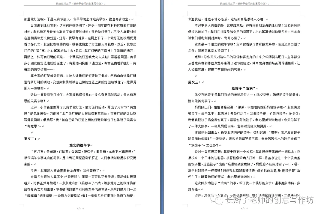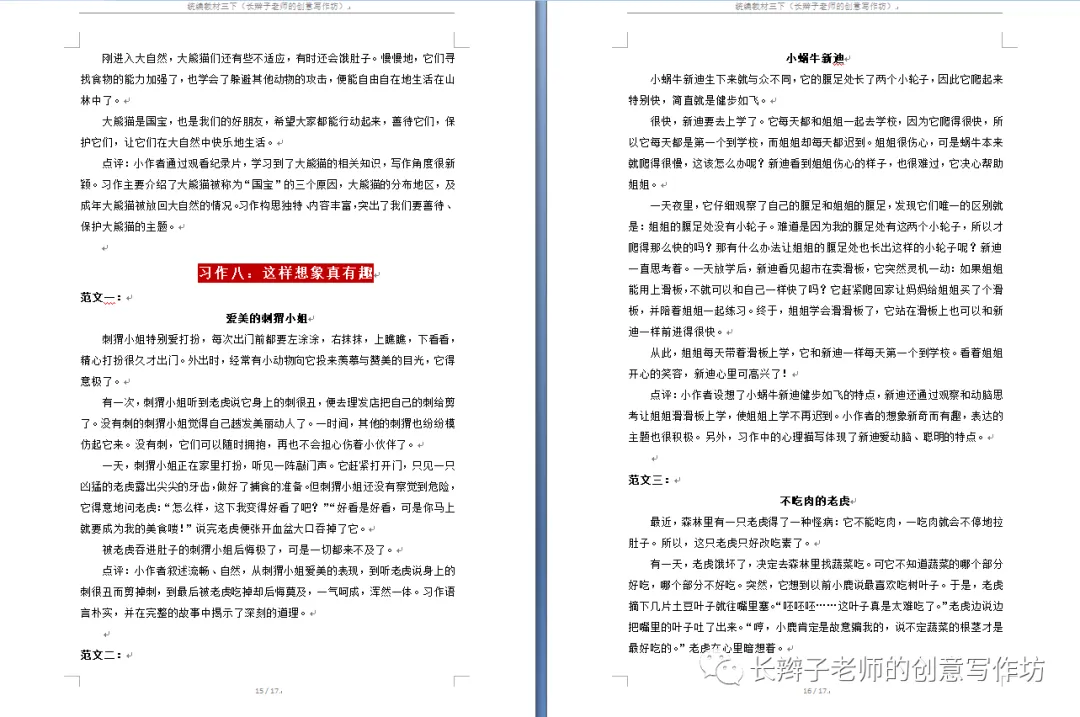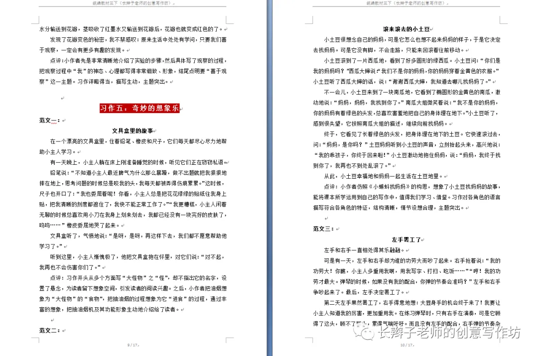 若需要(原创文集),请关注微信公众号“长辫子老师的创意写作坊”,在首页留言区写下6个字——三下习作范文,便会自动弹出提取链接。