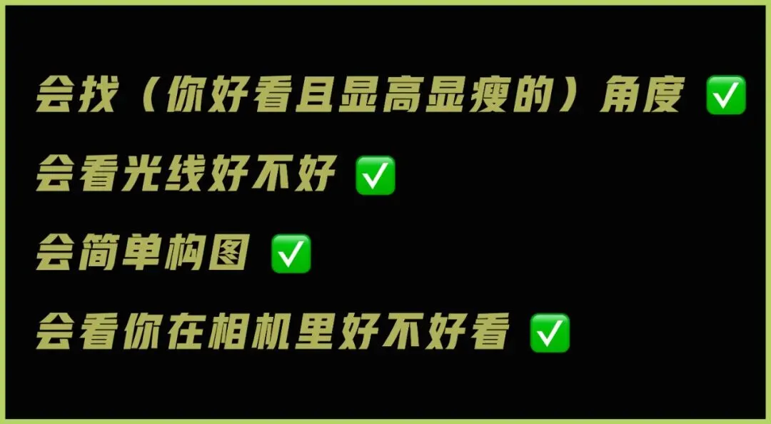 基本会第一点,第二、第三点都OK的。不过对于普通人来说,最重要还是第四点也,一定一定一定得留意你在镜头里好不好看!