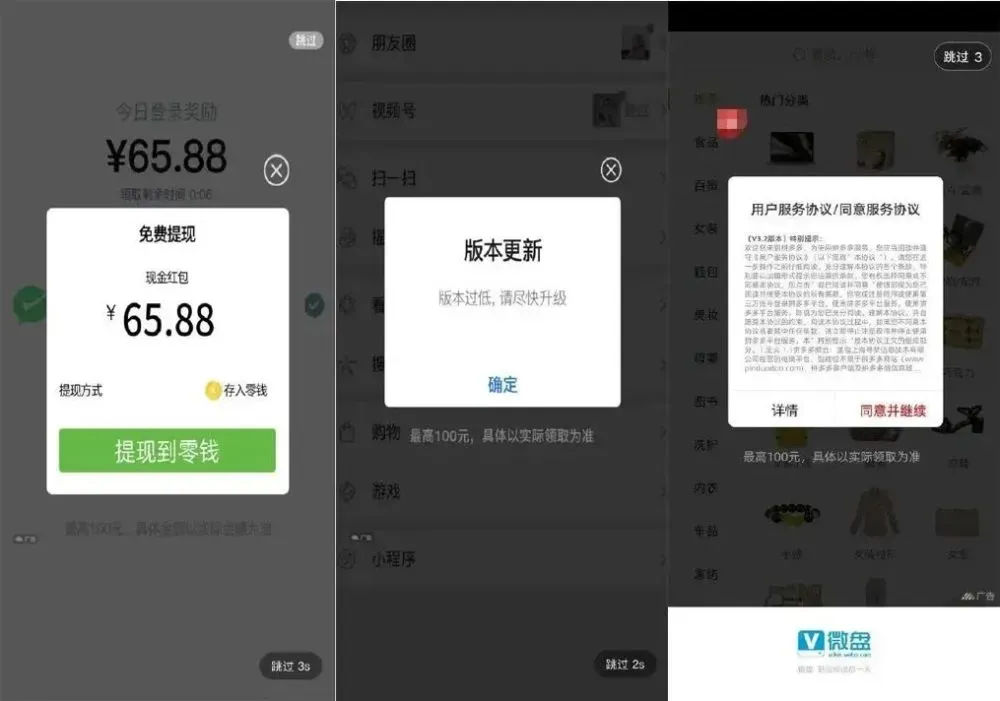 开屏广告的花样还有很多,一些开屏广告还会“伪装”成微信零钱提现、微信红包、未读消息、无网络服务提示、权限申请等消息提醒,诱骗点击。
