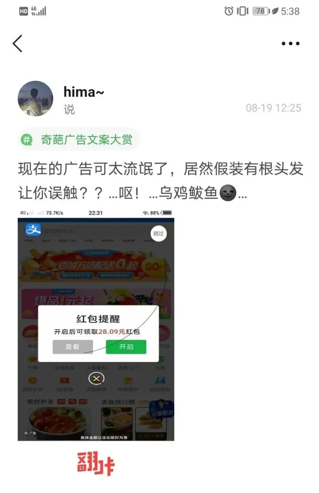 部分脑洞大开的开发者还想出了在开屏广告上加头发丝来欺骗用户误触的手段,简直让人啼笑皆非。