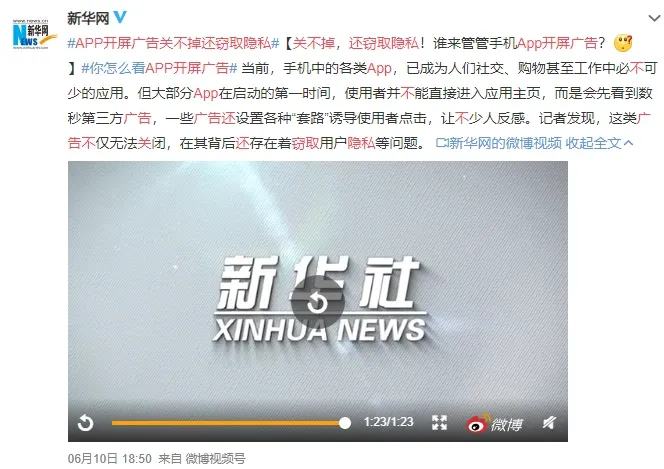 就在前不久,新华社还特别单独点名了手机app开屏广告吃相难看的这种不良现象。