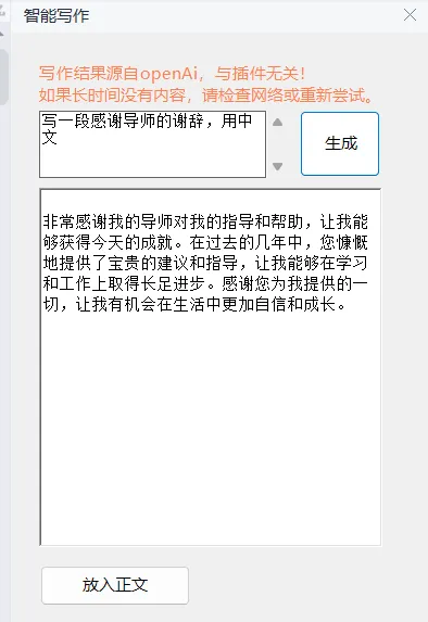 甚至插件还紧跟潮流,加上了调用chat GPT实现智能写作
