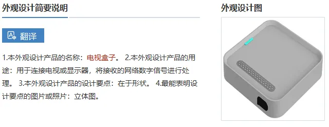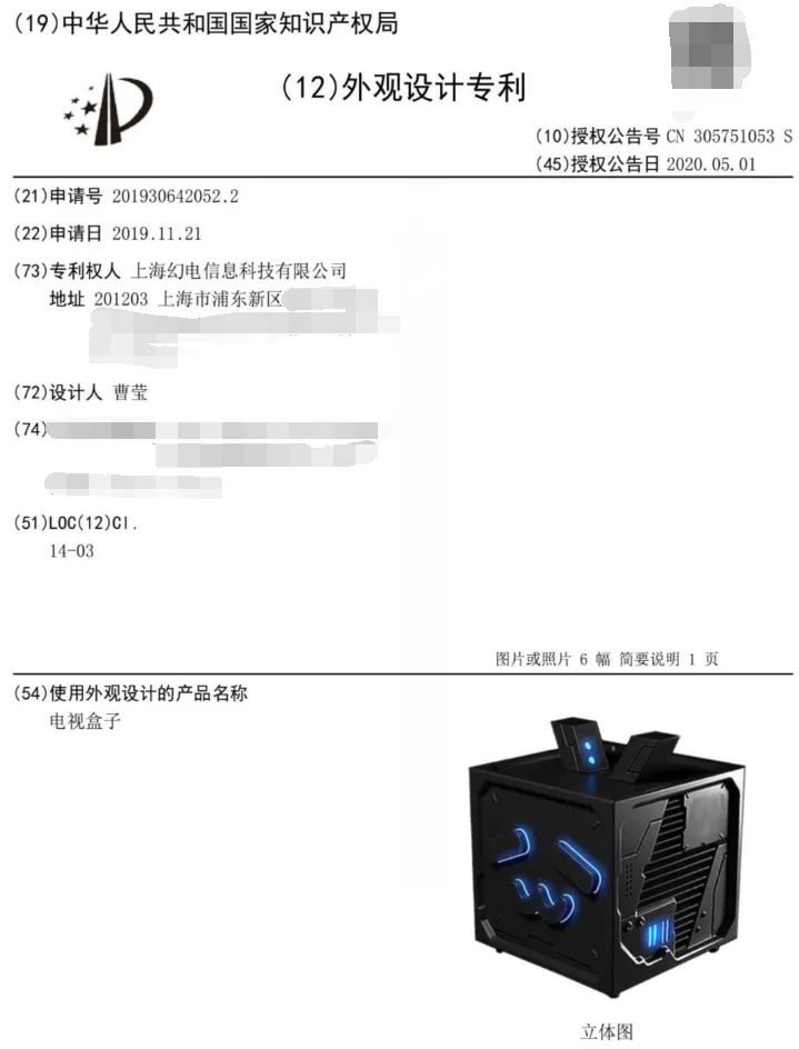 据悉,最新提交电视盒子的该专利用于视频信号转换为数字信号、装饰、收藏。其外观有着非常明显的二次元风格。