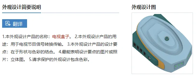 根据专利摘要,该外观设计产品的名称为电视盒子。用途为用于视频信号转换为数字信号、装饰、收藏。