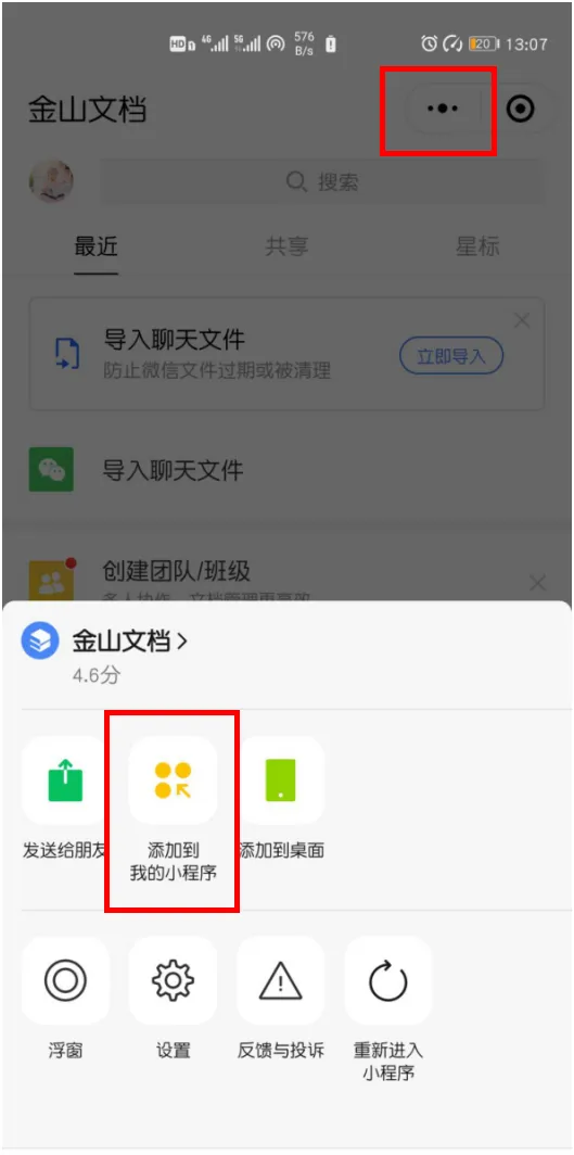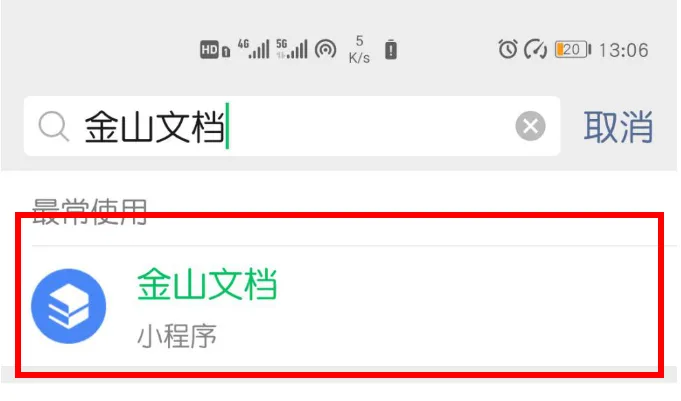 1. 确保在手机微信中使用过金山文档小程序,未使用过的可通过搜索小程序并添加。未使用过或添加的请按下述方法操作。