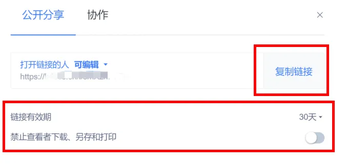 7.在分享页面可以设置分享链接有效期,以及是否允许他人另存、打印等。设置完成后点击复制链接。