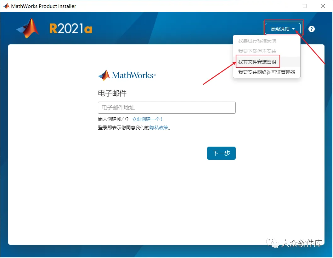 4.点击右上角的高级选项,选择我有文件安装秘钥;
