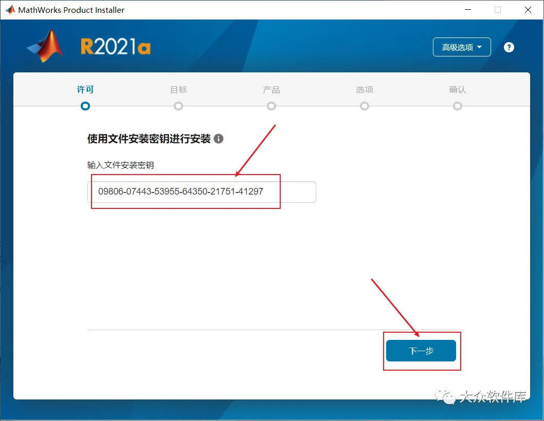 6.填写文件安装密钥:09806-07443-53955-64350-21751-41297,密钥和符号不要输错,否则安装失败。然后点击下一步;